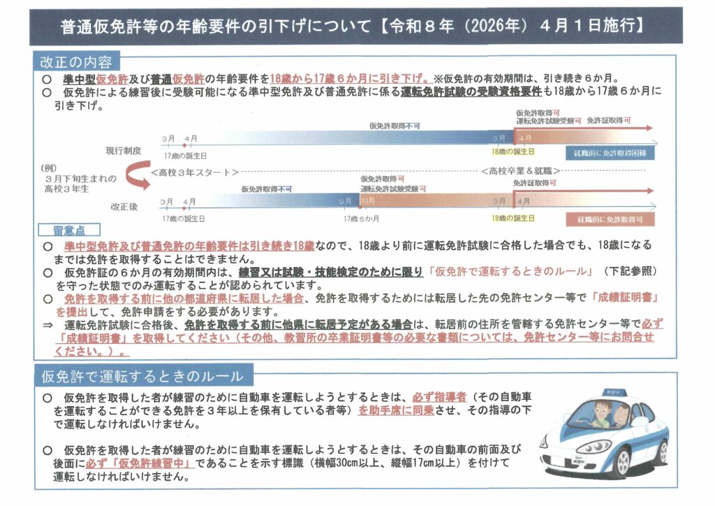 令和8年4月1日から普通車と準中型車の仮免許が17歳6ヶ月から取得できるようになります。